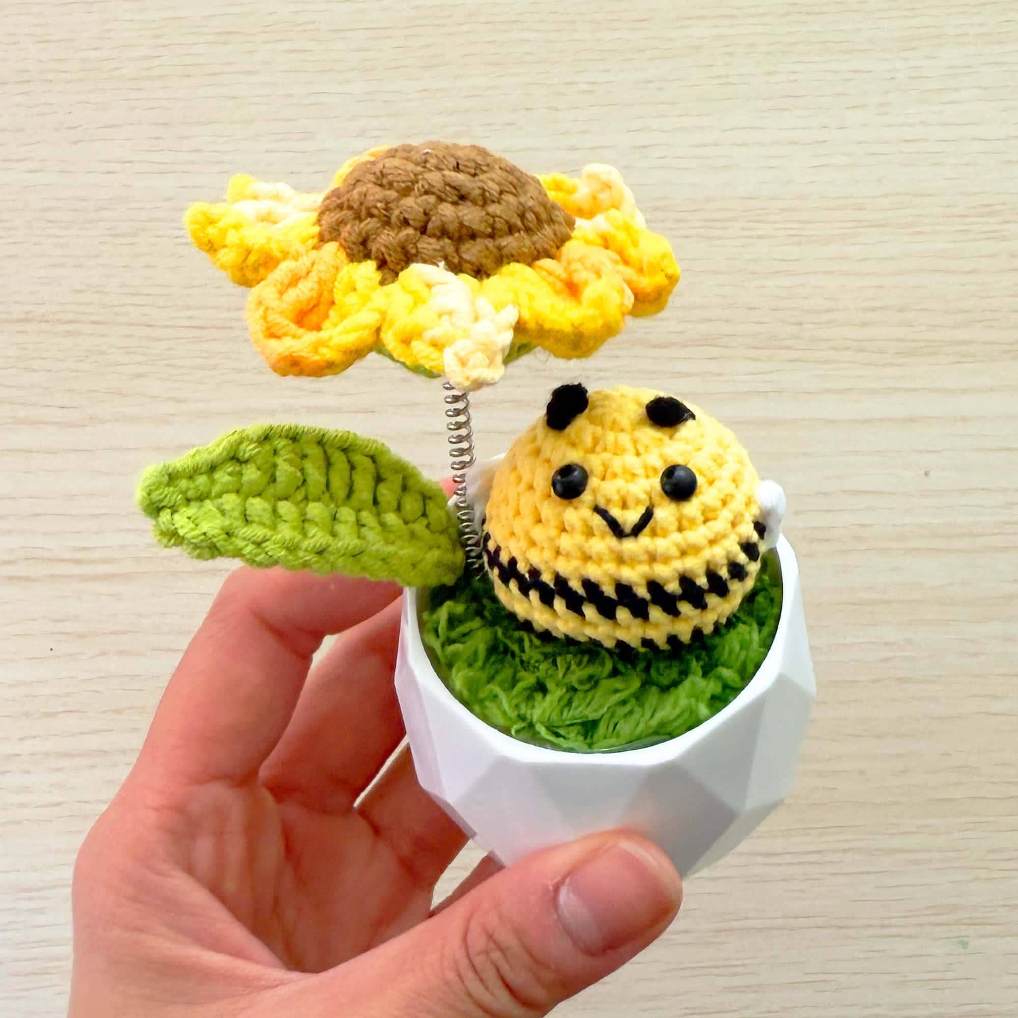 PinkLadyWorkshop - Handmade Crochet Frog and Bee Holding Sunflower Umbrella | Green | Cute Amigurumi Plant | Whimsical Decor | Gift Teacher Student Birthday: Frog